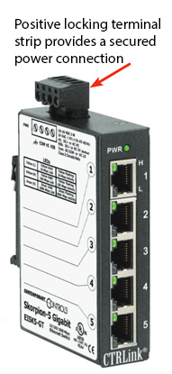 Our CTRLink switches can be powered with the same power source of the installed equipment in the control panel. There is no need to have higher voltages present in the panel to power the CTRLink switch. Our switches provide positive locking terminal strips – securely locking the power supply to the switch - eliminating power disruption. The screw-style power connector is easy to wire and durable for shipping to the job sites. Redundant power connections allow the switch to continue to run without disruption from the loss of primary power. The operating voltages allow for a backup power source without identical electrical criteria. Any voltage source in the specified range can serve as a backup power source – including batteries.