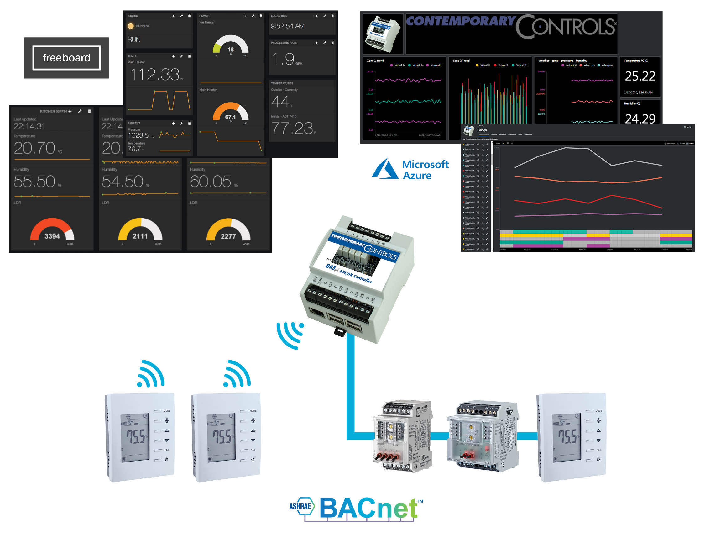 BACnet Client capability is just one feature of the BASpi-Edge. It also features a 24 VAC/VDC power input, resilient pSLC 8 GB micro SD card, BACnet client/server communication over Ethernet or Wi-Fi, and Sedona function block programming. Data processing at the edge, web page configuration with quick and easy cloud connectivity to Azure IoT Central (SaaS) cloud solutions – all these features make BASpi-Edge a versatile controller suitable for a wide array of applications.