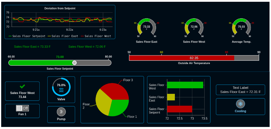 In a dashboard, integrators configuring the dashboard cannot upload images or freely position graphical elements but rather graphical elements/widgets, such as gauges, charts, trend graphs, buttons, labels, icons are placed in containers and positioned on the screen in desired order. This makes dashboards scalable across devices, such as tablets, smart phones and PC monitors. This is ideal for monitoring and/or controlling equipment over the BACnet network. A library of built in widgets is provided as seen in the example below.