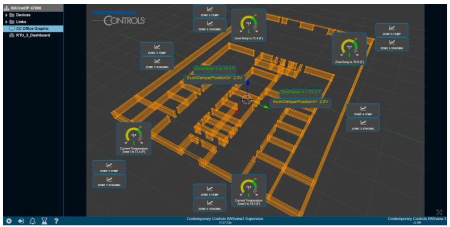 BASview3 is a stand-alone, embedded, web-based graphical interface for building automation and process automation systems. It can be accessed from any web browser – providing supervisory functionality to any BACnet/IP or Modbus TCP system. By using Contemporary Controls BASrouter or BASgateway products, additional protocols such as BACnet MS/TP and Modbus RTU are supported.