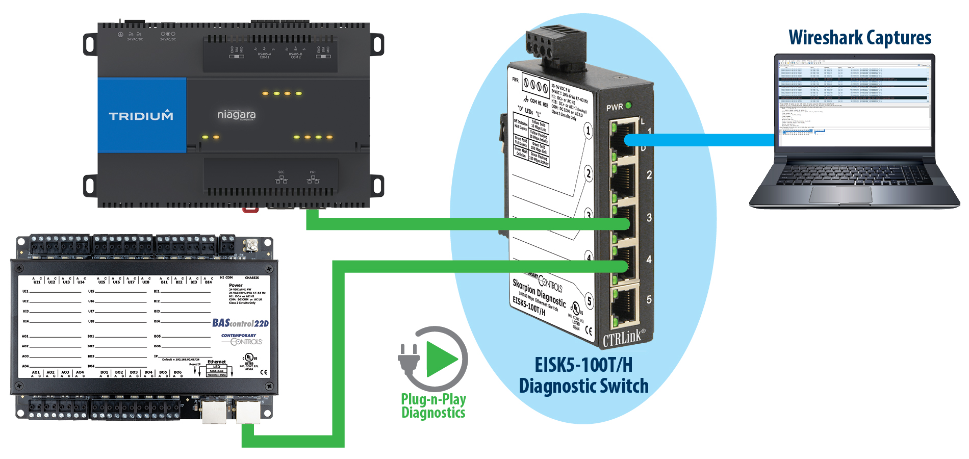 Skorpion Diagnostic Switches help troubleshoot Ethernet networks by allowing a network sniffer, such as Wireshark®, to attach to an unused port on the switch and observe all traffic on the network.