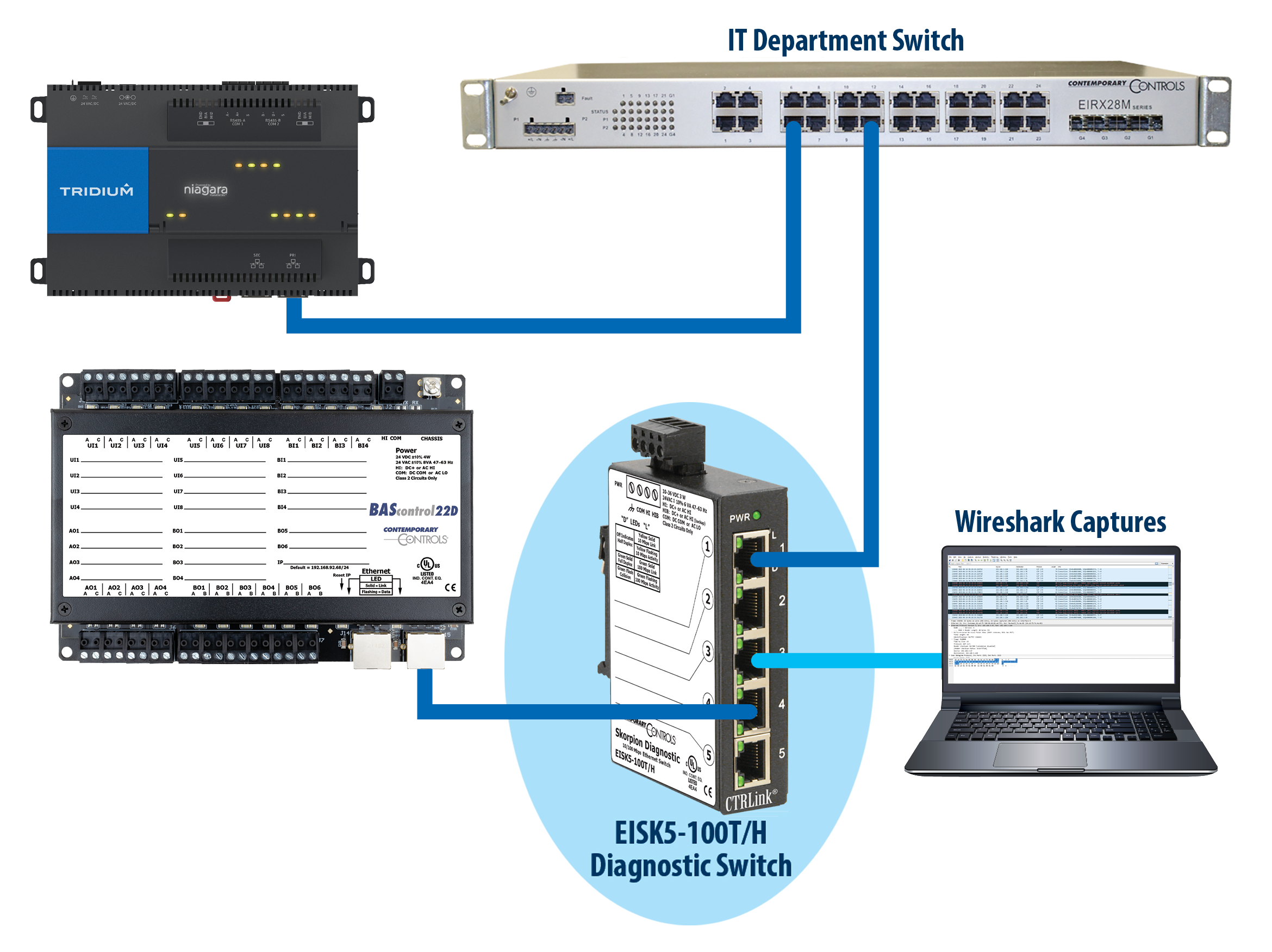 You can capture BACnet/IP messages using Contemporary Controls' Skorpion Diagnostic Switch that is connected to a PC running Wireshark. By placing the Diagnostic Switch between any BACnet/IP device and the rest of the network (as shown in Figure 1), you can capture transmitted or received BACnet/IP messages. These messages can provide a wealth of data for equipment vendors to help diagnose issues with the equipment in your facility. In Figure 2, all traffic to/from the controller is monitored, allowing you to analyze communication issues that may occur with the controller. In Figure 3, all traffic to/from the Jace is monitored, allowing you to analyze communication issues that may occur with the Jace.