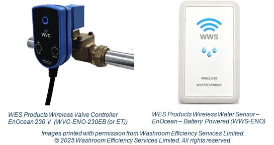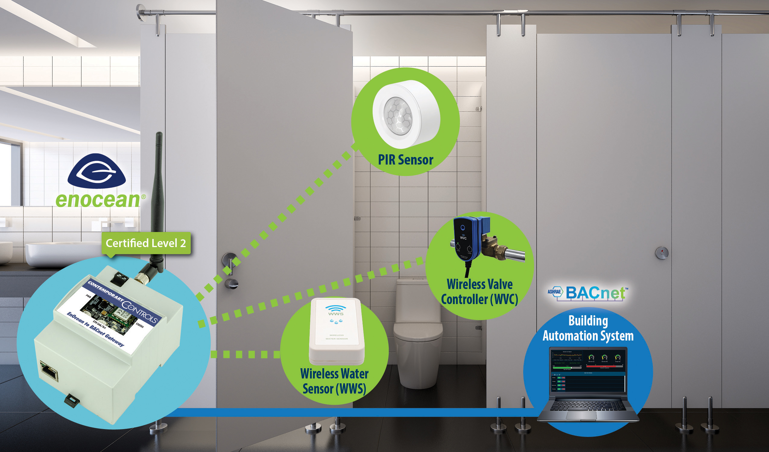 A wireless leak detection system based on EnOcean technology and Contemporary Controls' EnOcean to BACnet gateways combines wireless sensors, smart valve controllers, and standardized building automation protocols to provide comprehensive protection against water damage while improving safety and energy efficiency and ensuring regulatory compliance. By automatically shutting off water when spaces are unoccupied and immediately responding to detected leaks, the system dramatically reduces the risk of water damage. The battery-operated wireless water sensors eliminate electrocution risks associated with traditional wired sensors. The wireless setup eliminates complex wiring, reducing installation costs and time. The system can be easily reconfigured or expanded as building needs change.