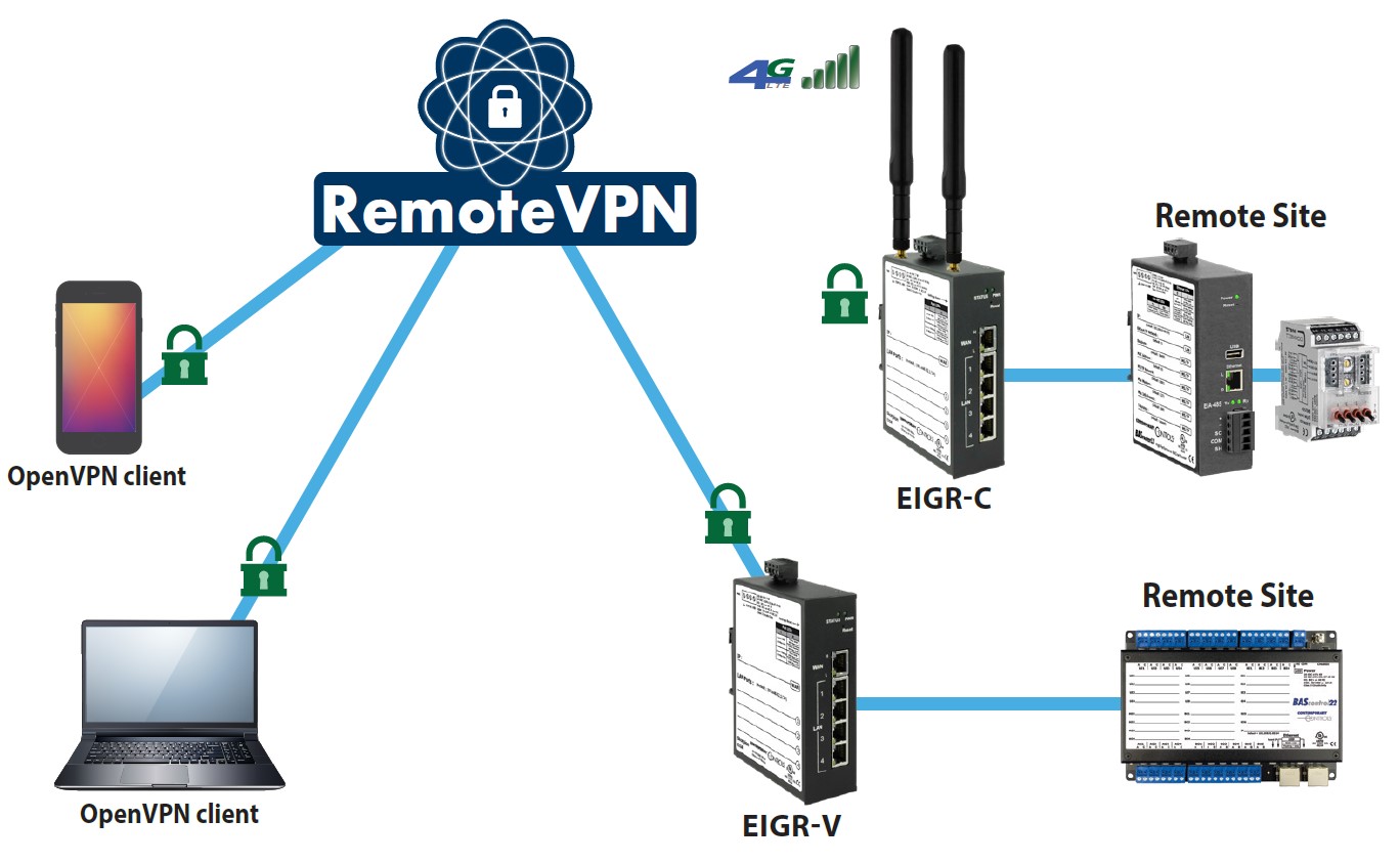 Contemporary Controls' EIPR-V, EIGR-V series and EIGR-C series Skorpion IP routers support OpenVPN® client functionality and can be used with our RemoteVPN subscription service. Our EIGR-V, EIGR-VB routers can be configured as VPN servers for our Self-HostedVPN and BridgeVPN solutions.