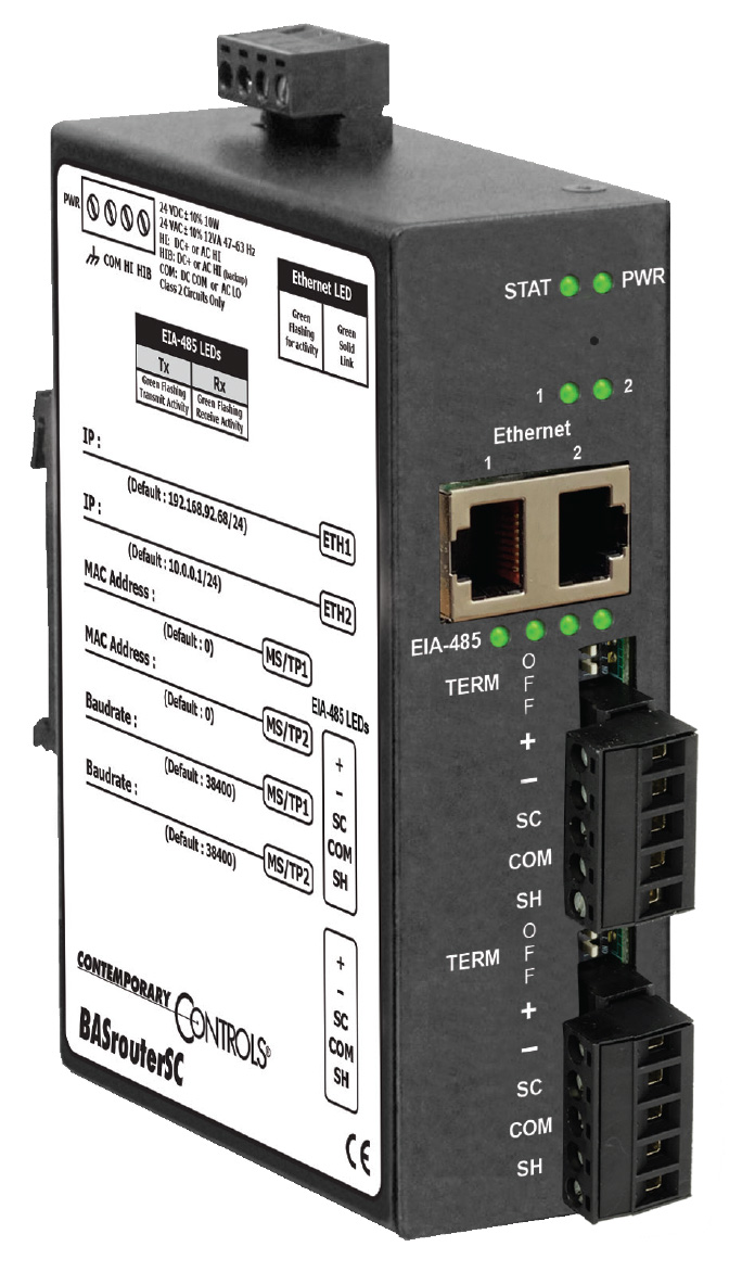 As BACnet networks may be a mix of BACnet/IP and BACnet/SC, the BASrouterSC provides two Ethernet ports, one for the BACnet/IP network and one for the BACnet/SC network. Thus, the Ethernet infrastructure supports secure BACnet/SC communications while connecting to one or more isolated BACnet/IP devices.