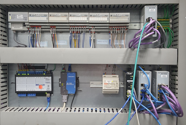 At the top are AB EtherNet/IP remote I/O modules. One of the BAScontrol20 BACnet client controllers is at the lower left. Next to it is the industrial PC which runs the GCOP energy optimizer program. To the right of the power supply is the EIPR-V VPN router.